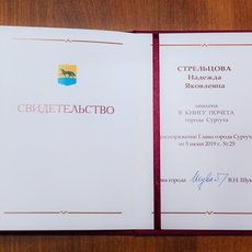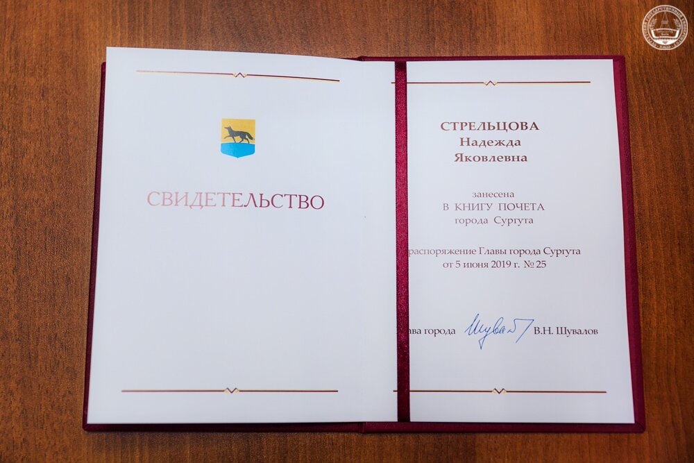 Книга Почета была утверждена в 2008 году, а сегодня уже пишется новая история. Так в третий том вошли: 16 исторических личностей, оказавших влияние на развитие Сургута, 13 отличившихся в развитии новой истории города, начиная с 25 июня 1965 года, 20 горожан, гордо несущих звание «Почетный гражданин города Сургута», а также 5 сургутян, отмеченных «За вклад в развитие города» и 92 человека, награжденных знаком «За заслуги перед городом Сургутом». Такого нагрудного знака теперь удостоена и заместитель председателя Попечительского совета СурГУ, кандидат педагогических наук, доцент, заслуженный учитель Российской Федерации, член-корреспондент Международной академии наук педагогического образования Надежда Стрельцова.