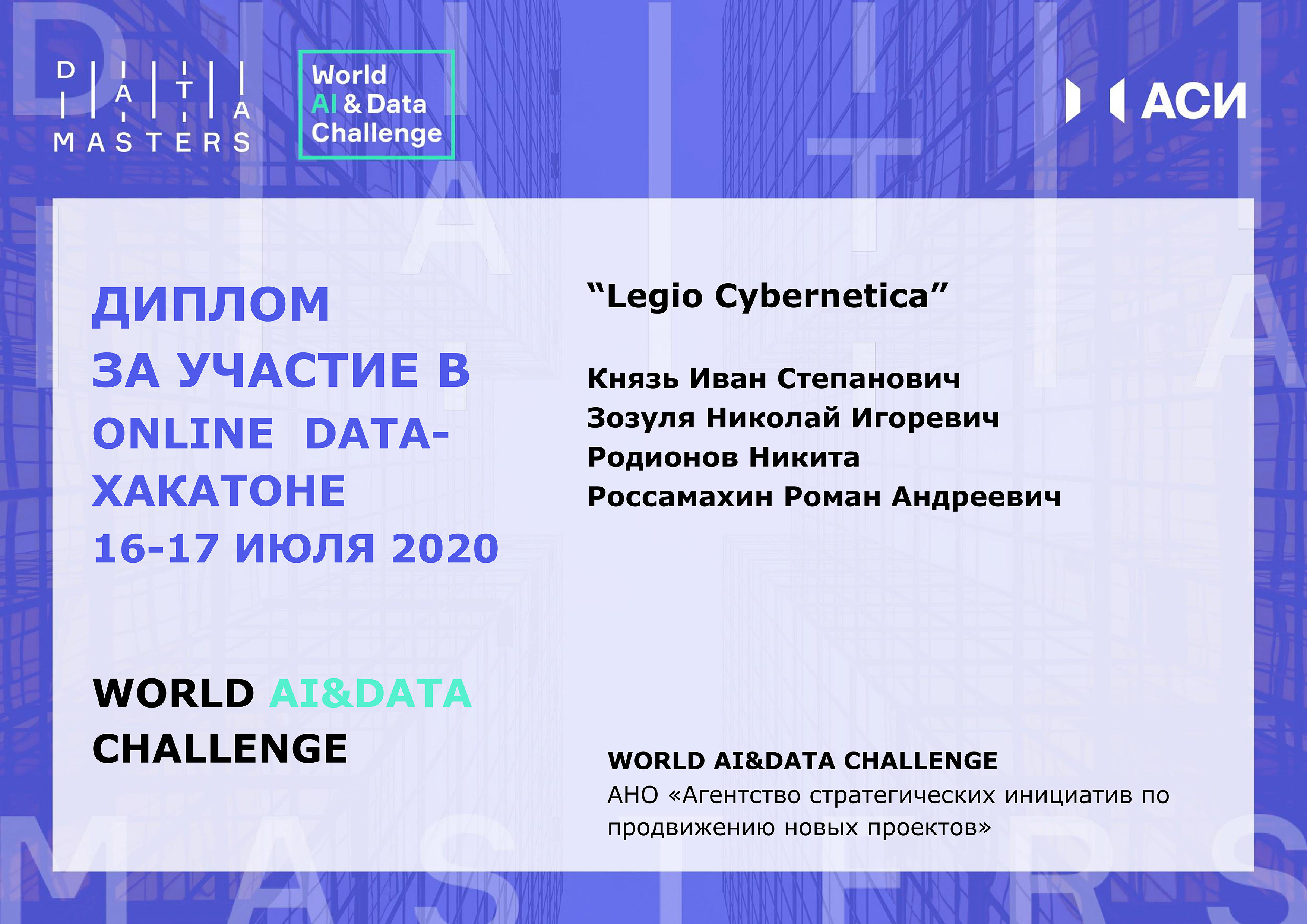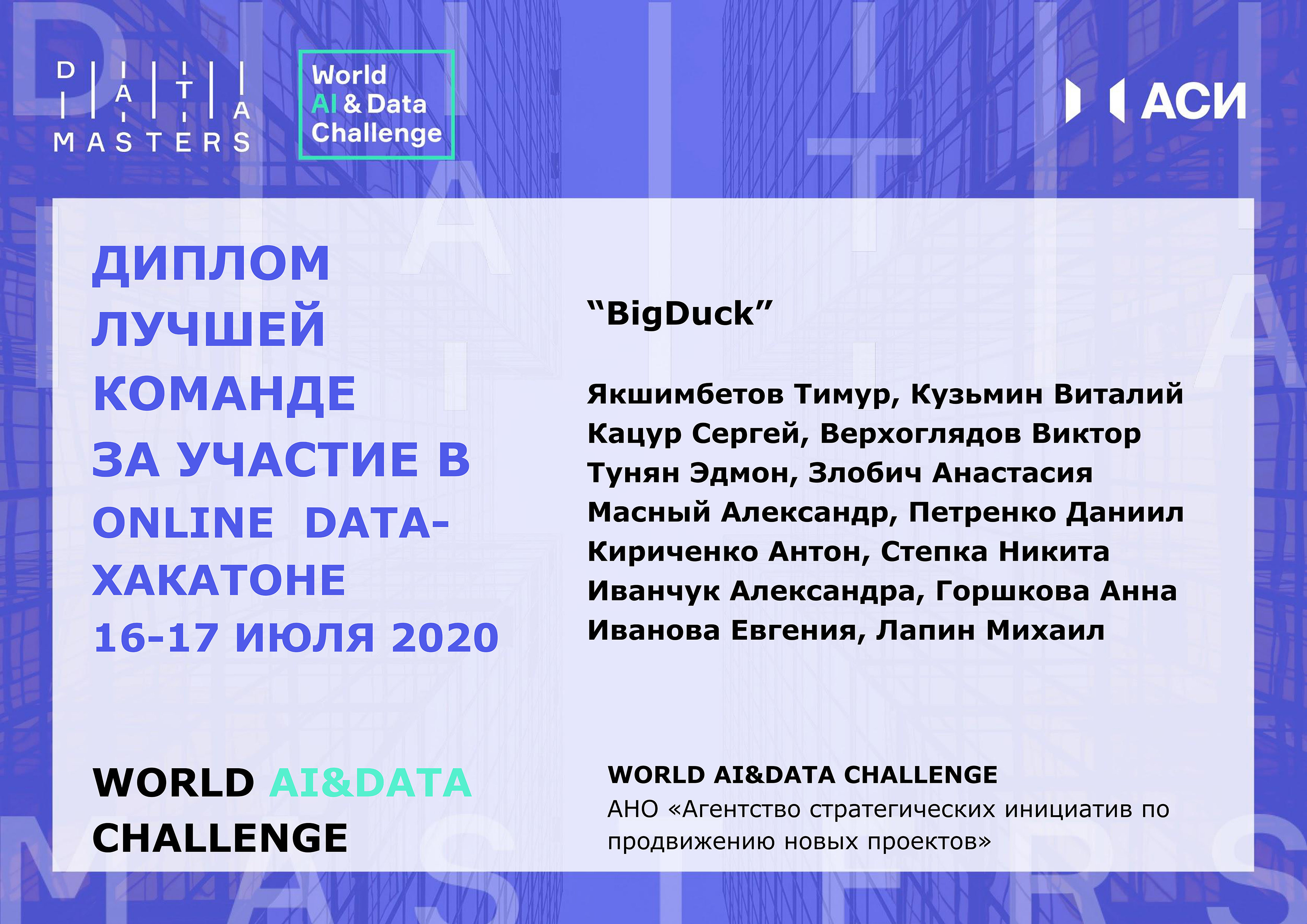 По итогам 48-часового онлайн-интенсива Агентство стратегических инициатив по продвижению новых проектов наградило дипломом за участие команды к Dawning и Legio Cybernetica. И сразу три команды СурГУ, оставившие свой цифровой след, – BigDuck, Team, UknikiUkniki признаны сообществом экспертов лучшими!