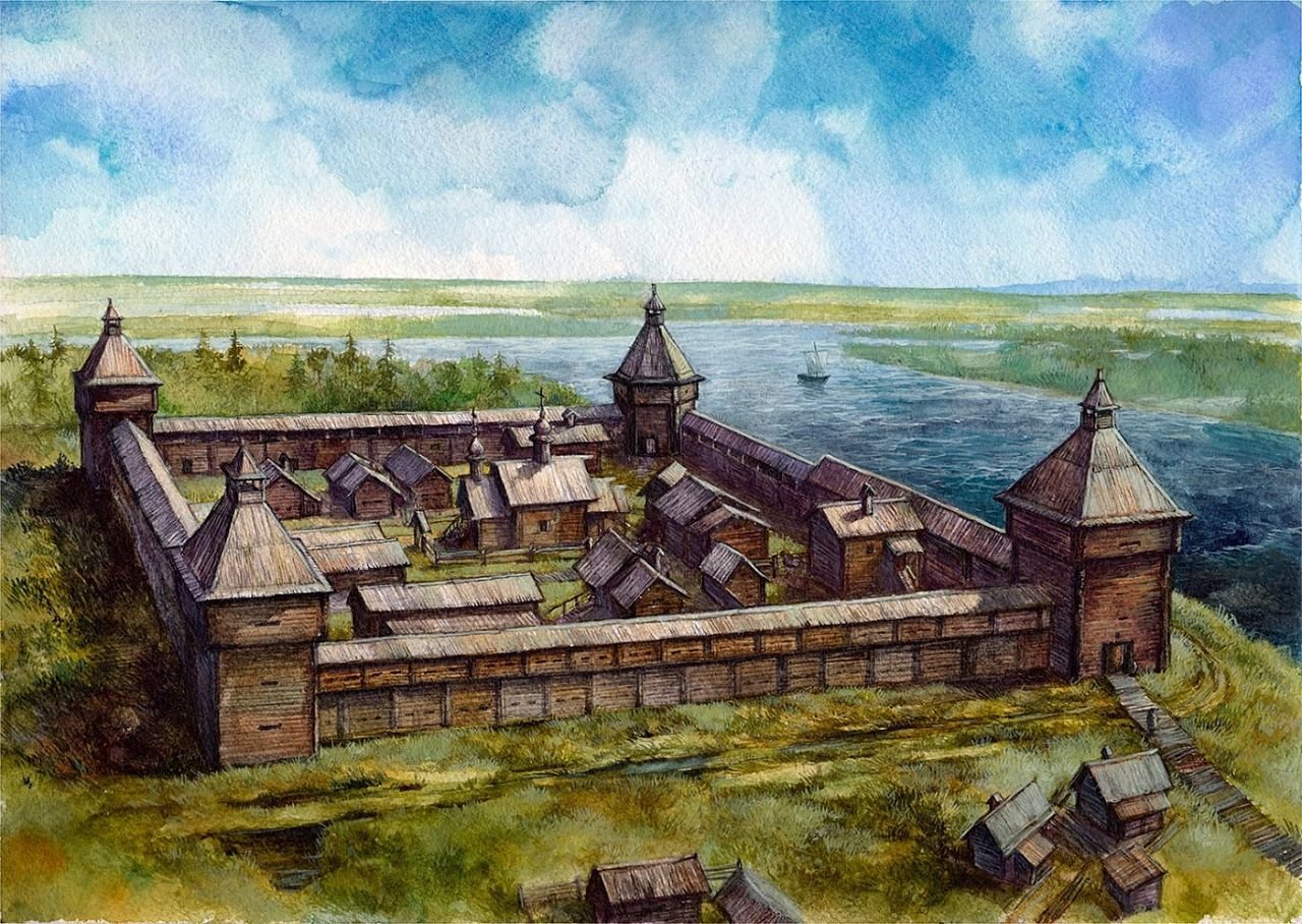 «Острог был поставлен в 1593 году отрядом при воеводе Микифоре Траханиотове (руководитель отряда), князе Михайле Волконском (лицо от государя) и письменным голове Иване Змееве (делопроизводитель). В отряде с ними были 300 ратных людей (служилые люди, прибывшие на постоянное место жительства, занимались сбором ясака, обслуживанием крепостей и их строительством по всей Сибири, обороной и пр.). Фактически – это представители власти Московского государства в Сибири. И еще 150 человек с Перми, Соли Вычегоцкой, Вычегды и со всей страны – прибыли на год, только помочь с возведением острога, потом разъехались по домам».