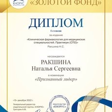 Диплом победителя в номинации Наталья Сергеевна рассматривает как закономерный результат многолетнего труда над качественной учебной литературой в приоритетной для себя сфере образования. Останавливаться на достигнутом она не планирует, поскольку фармакология – не статичная дисциплина, изменения происходят постоянно.
