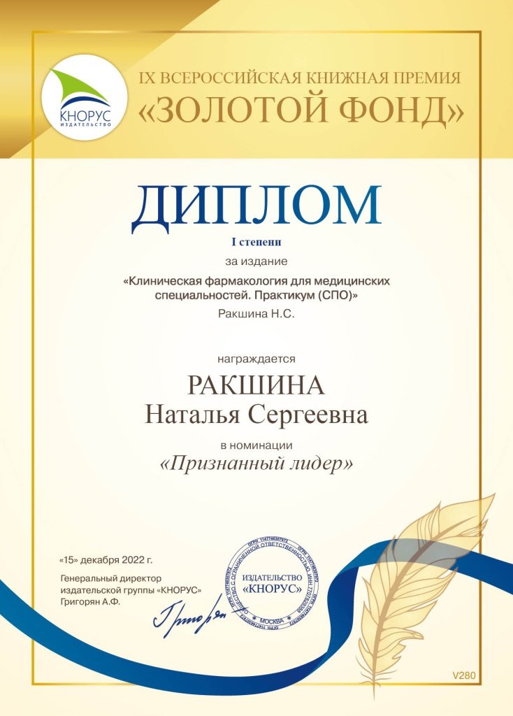 Кандидат биологических наук, преподаватель высшей категории Медицинского колледжа Сургутского госуниверситета Наталья Ракшина подготовила третье, переработанное и дополненное издание учебного пособия «Основы фармакологии с рецептурой». И одержала победу в номинации «Признанный лидер» IX Всероссийской книжной премии «Золотой фонд» за издание практикума по клинической фармакологии для СПО.