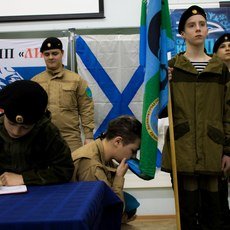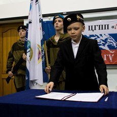 Церемония дачи клятвы проходила в следующем порядке: воспитанник подходил к столу, читал текст, вставал на колено и целовал флаг. Мне больше всего заполнилась строчка: "Жить, учиться, творить, работать всегда и везде во Славу Великой России. Клянусь! Клянусь! Клянусь!".