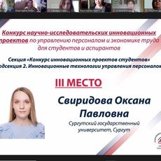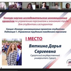 По итогам финальной защиты проектов 13 мая в режиме видеоконференции на площадке Zoom с организацией трансляции на платформе Twitch диплома 1-й степени за первое место в Конкурсе научно-исследовательских инновационных проектов по управлению персоналом и экономике труда для студентов и аспирантов в секции «Управление трудовым поведением персонала» удостоена Дарья Вяткина. Диплом 2-й степени за второе место в секции «Инновационные технологии управления персоналом» у Карины Хайбулловой. В этой же секции диплом 3-й степени за третье место у Оксаны Свиридовой.