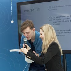 Организаторы делят всех участников на команды и проводят викторины, конкурсы, музыкальные квизы, все задания на английском языке.