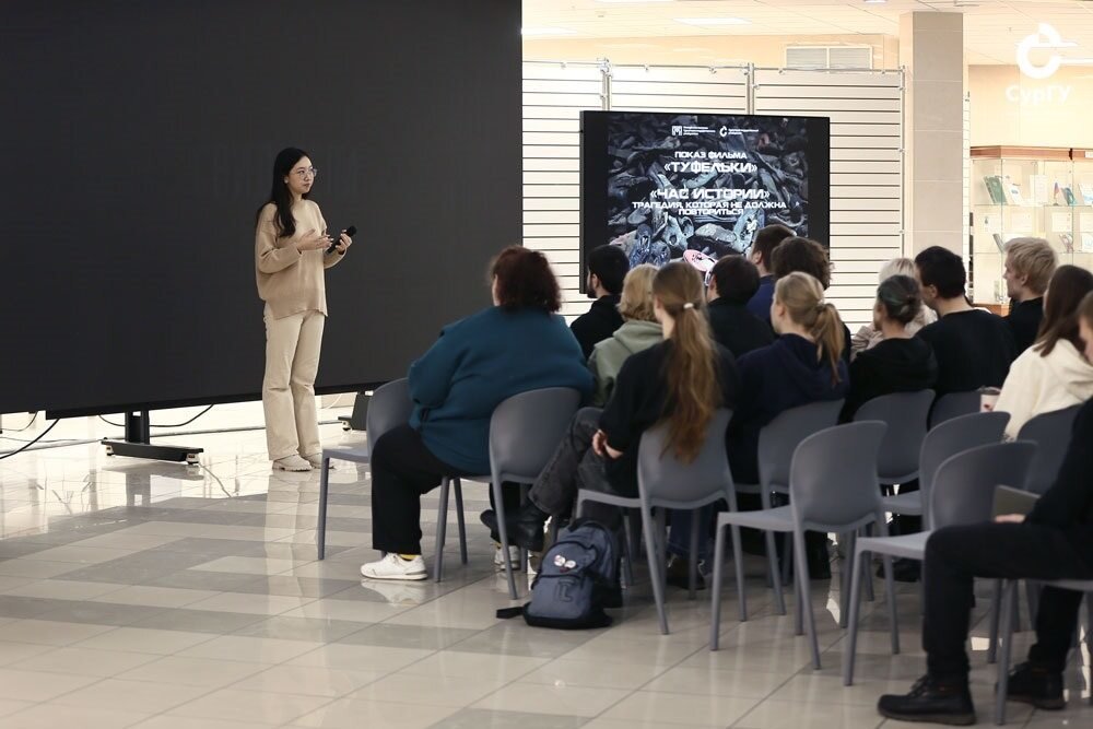 В атриуме 29 января прошли просмотр и обсуждение короткометражного фильма «Туфельки» (2012). Через призму вещей, безо всяких диалогов, не показывая лиц актеров, лента рассказывает историю жизни обычной еврейской девушки – одной из многих, погибших в немецких лагерях смерти. Сразу же после просмотра фильма состоялся диалог о важном «Час истории. Трагедия, которая не должна повториться». В качестве эксперта выступил доцент кафедры политологии СурГУ Василий Мархинин. Его доклад был посвящен блокаде Ленинграда. Знать об этом важно и нужно, считает эксперт. Василий Васильевич проанализировал подготовку и проведение Ленинградско-Новгородской операции 14 января – 1 марта 1944 года, а также быт жителей блокадного Ленинграда. В частности, были представлены фотографии книг научного, прикладного и досугового характера, издававшиеся в городе в то время.