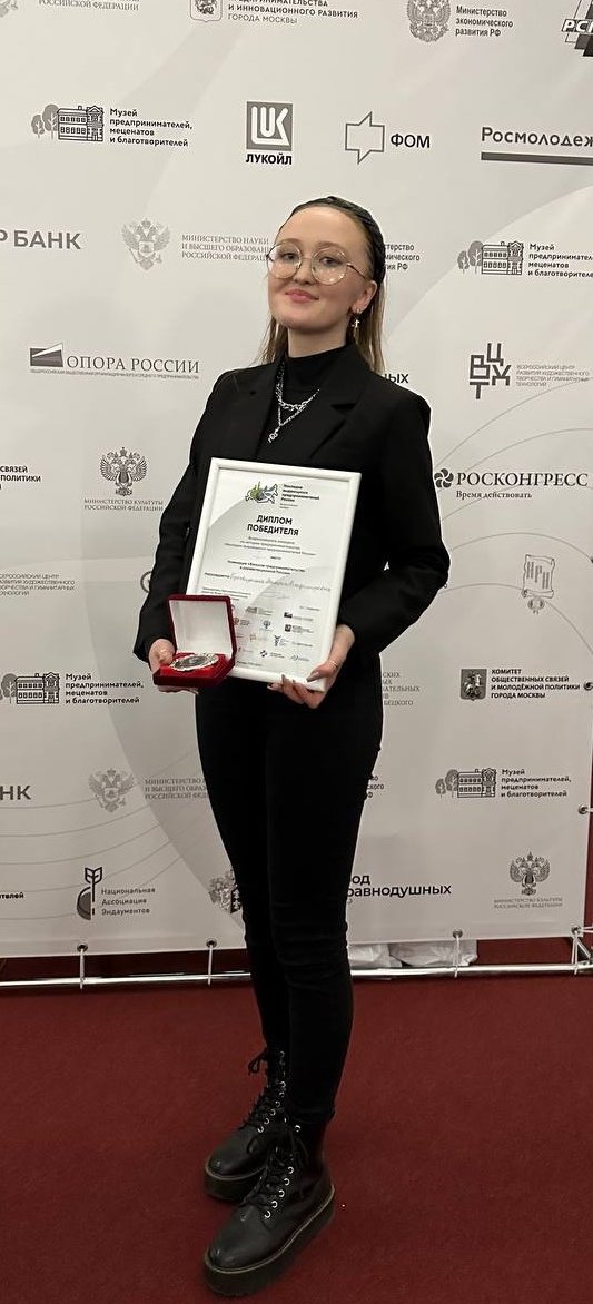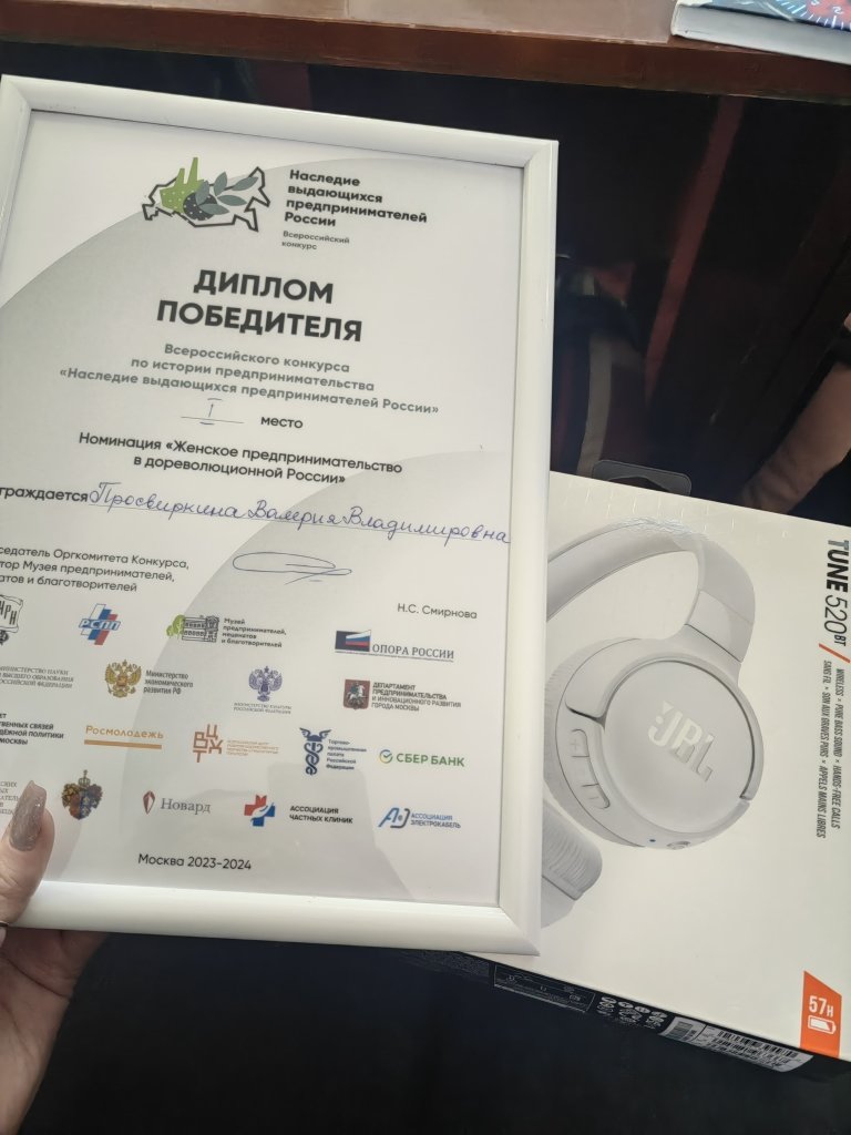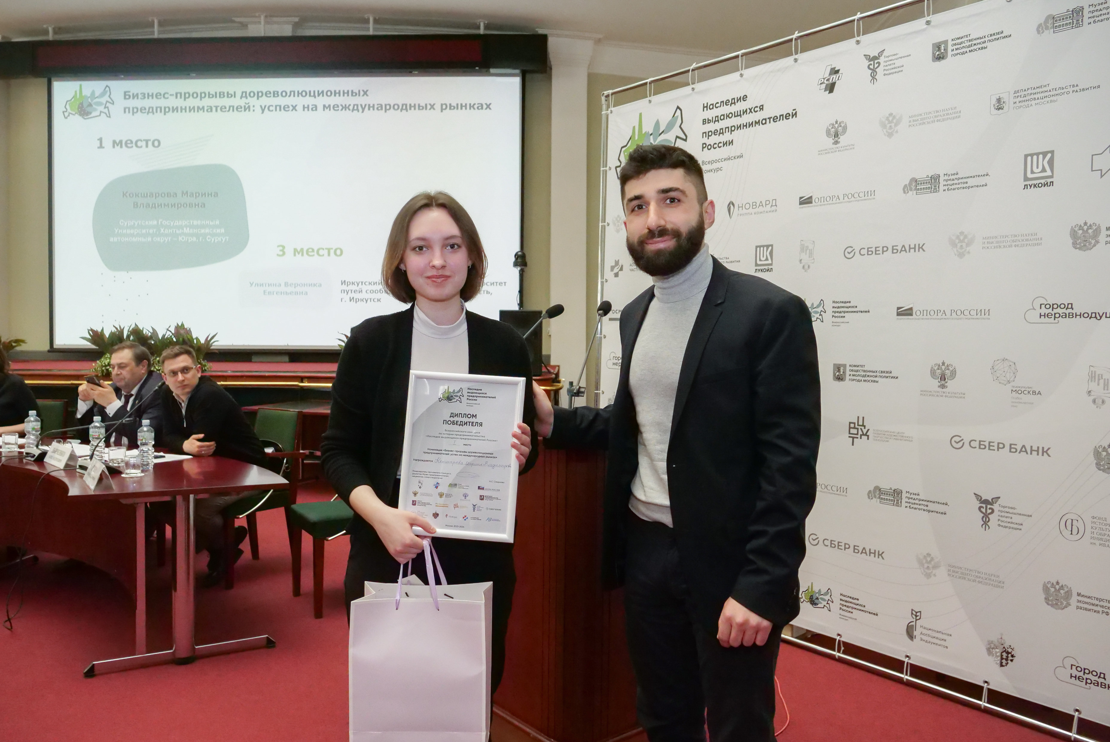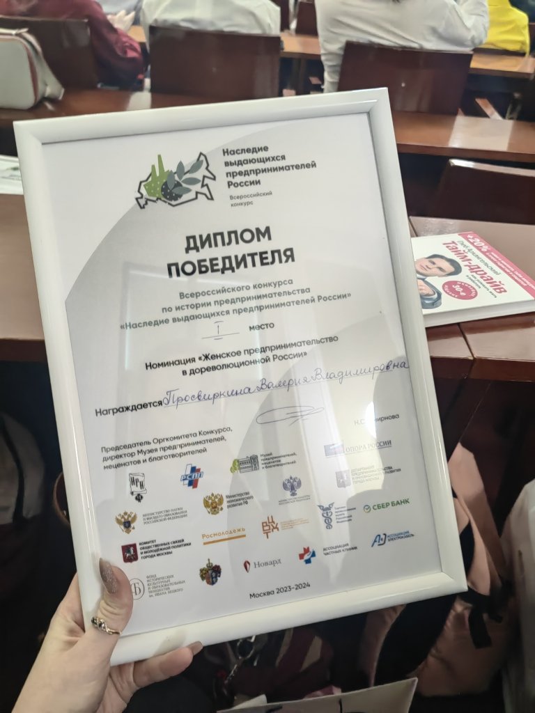 - в номинации «Женское предпринимательство в дореволюционной России»: 1-е место у магистранта и преподавателя СПО (г. Ноябрьск) Валерии Просвиркиной. Валерия Владимировна удостоена медали А. И. Абрикосова по решению потомка этой династии;