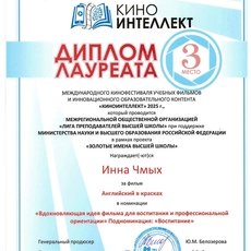 В Белом зале Государственного геологического музея им. В. И. Вернадского Российской академии наук 16 мая 2025 года на Торжественной церемонии награждения победителей Международного кинофестиваля учебных фильмов и инновационного образовательного контента «КиноИнтеллект – 2025», который проводится Межрегиональной общественной организацией «Лига преподавателей высшей школы» в рамках проекта «Золотые имена высшей школы» при поддержке Министерства науки и высшего образования РФ в рамках проекта «Золотые имена высшей школы», видеосюжет «Английский в красках» (“English in Living Colours”) студентов группы 208-22а направления «лингвистика» СурГУ под руководством к. п. н. доцента Чмых И. Е. получил диплом лауреата III степени и признан одним из лучших в номинации «Вдохновляющая идея фильма для воспитания и профессиональной ориентации» в подноминации «Воспитание», направленной на формирование нравственных и культурных ценностей у молодежи.